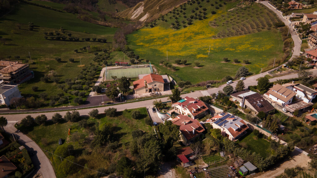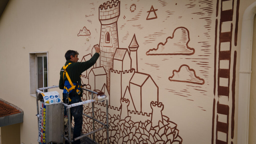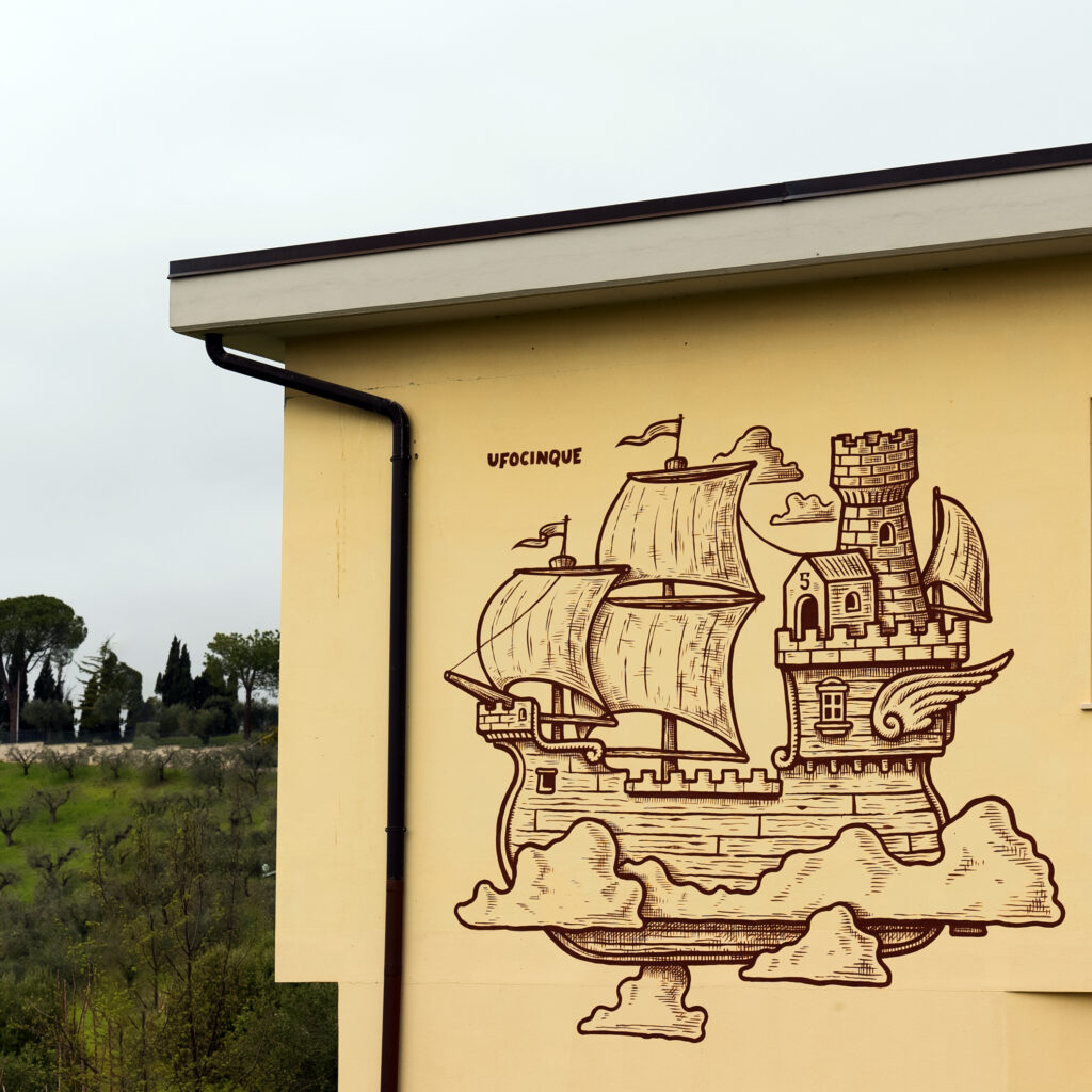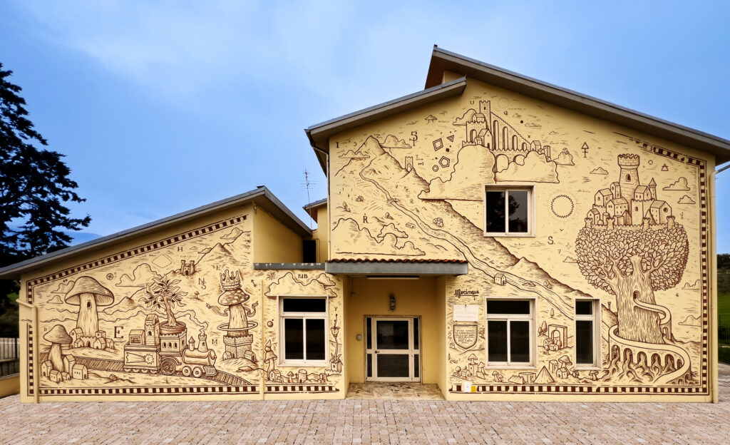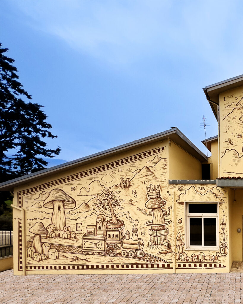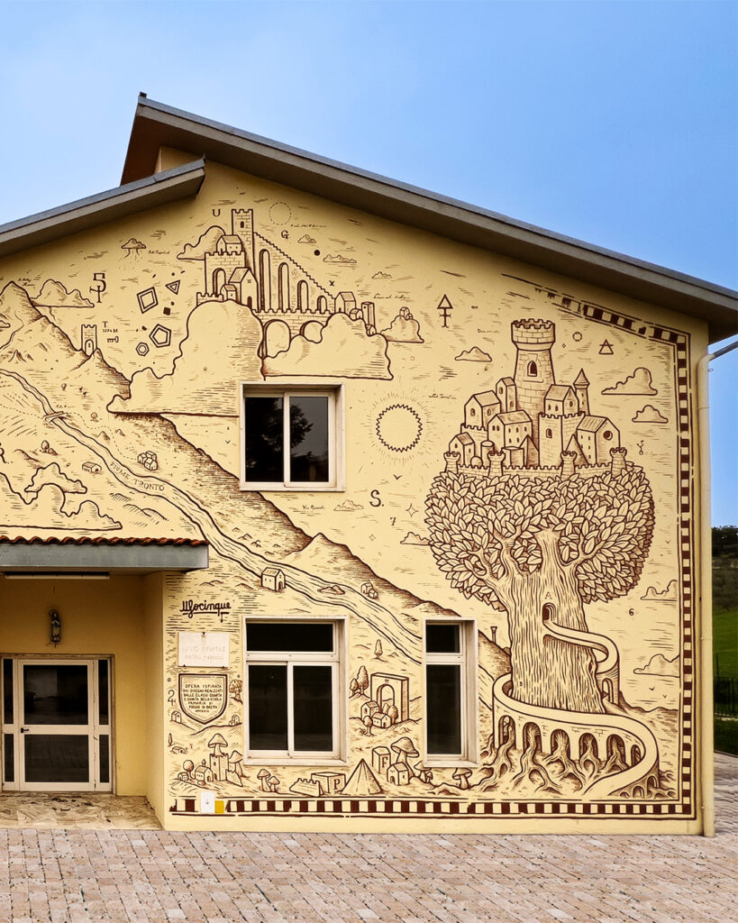 L’opera realizzata è una pittura muraria che si rifà alla cartografia medievale: l’artista ha rappresentato un luogo immaginifico, ideato attraverso i disegni realizzati dai bambini della scuola, dai quali lo stesso ha preso spunto. Al centro una montagna imponente, dalla quale nasce il Tronto che scende fino a valle. Il fiume bagna un grande albero su cui è stata costruita una città ideale, quella che si regge sulla natura in condivisione. Accanto, un treno città che trasporta un giovane alberello, simbolo delle nuove generazioni, attraverso un boschetto di “funghi case”. Simboli numeri e lettere creano un didascalia della mappa, se interpretati, questi indizi portano ad un tesoro nascosto. Questi hanno anche l’obiettivo di stimolare la curiosità dello spettatore nel trovare un proprio significato nascosto. Ancora, una nave volante si dirige verso la valle, è un buon augurio per il futuro. L’idea è stata sviluppata dopo il confronto con gli studenti del plesso di Poggio di Bretta (AP) della Scuola Primaria I.S.C. Don Giussani – Monticelli. L’artista, lavorando con i bambini, ha preso spunto dai loro disegni, cercando di sfruttare a pieno la loro fantasia: ne risulta una mappa immaginifica, co-creata, dove si dà ampio spazio alla loro immaginazione. L’opera è arricchita di dettagli che rappresentano monumenti, riferimenti, luoghi caratteristici della città di Ascoli Piceno e delle sue frazioni.